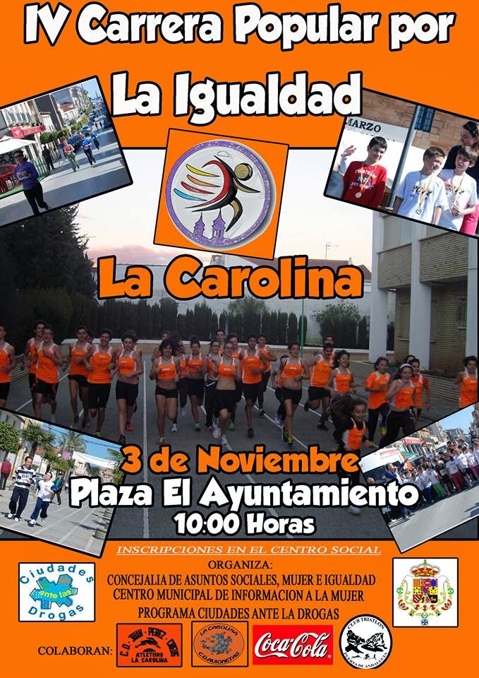 El pasado domingo día 3 de Noviembre, se celebró en La Carolina (Jaén), la "IV CARRERA POPULAR POR LA IGUALDAD", organizada por el Centro Municipal de Información a la Mujer y Excmo. Ayuntamiento de La Carolina, haciéndolo como colaboradores el Club Deportivo Las Avionetas, C.D. Atletismo Juan Pérez Creus y Club Triatlón Puerta de Andalucía, todos ellos pertenecientes a esta localidad.